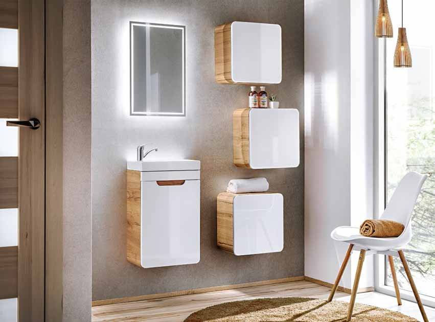 Aruba je nezvyčajná kolekcia, ktorá zaujme svojím ľahkým a moderným dizajnom. Farbne ladené drevené telo v kombinácii s bielymi čelami vytvára jemný celok v atmosfére tropického SPA. Zaoblené hrany všetkých skriniek dodávajú kolekciu originálneho charakteru a ľahkosti a čelo bez rúčky odkazuje na najnovšie trendy v dizajne interiéru. Kolekcia sa skladá z nízkych a vysokých skríň v rôznych variantoch, čo umožňuje zostaviť individuálny a jedinečný set. Zaujímavým a mimoriadne módnym riešením je nepochybne skrinka pre umývadlo, ktorá sa ponúka vo viacerých rozmeroch. Kolekcia Aruba osloví všetkých, ktorí hľadajú neobvyklé a moderné riešenia pre svoju kúpeľňu.
