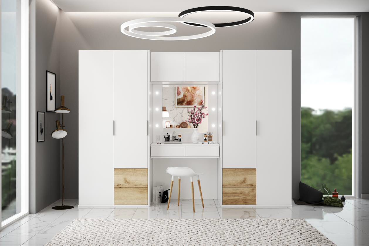 Výborne dizajnovo riešenou zostavou je zostava skríň so zakomponovaným toaletným stolíkom Latina. Mať všetky potrebné veci po jednej ruke, je snom každej ženy - táto skriňa to plní na 100%. Množstvo prakticky rozmiestneného úložného priestoru je obrovským plusom. Zostava je vhodná do študentskej izby, do predsiene alebo samozrejme do spálne. Prepojenie bieleho dekoru s troškou prírodného dubu grand zaisťuje univerzálnosť.