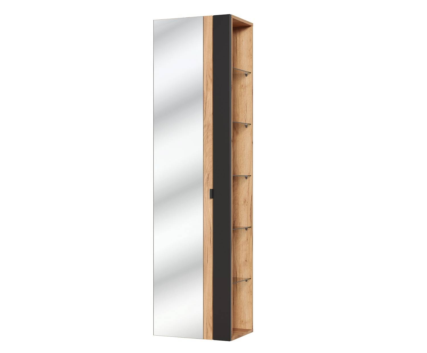 - Závesná kúpeľňová skrinka CAPRI so zrkadlom a jedným dvierkom - vnútro skrinky obsahuje 5 drevených políc a 5 sklenených políc vo vonkajšej časti.