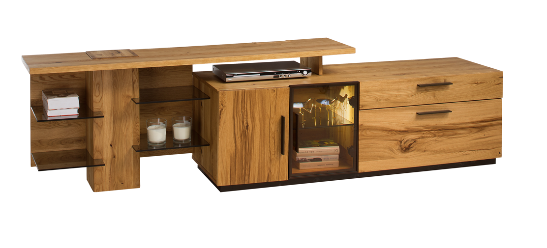 MORENO je kolekcia pri ktorej sú použité unikátne ručne opaľované dýhy zo starých dubov rastúcich vo vysokohorskej mikroklíme. Tento nábytok patrí medzi luxusné typy moderného prevedenia nábytku. Jedinečné spojenie naturálneho olejovaného farebného prevedenia kombinovaného s čiernou farbou tiahnú tento sektor k loftovému typu nábytku. Zaujímavo riešené prvky vytvoria vo Vašej obývačke alebo jedálni jedinečné miesto, ktoré bude pútať pozornosť aj o niekoľko rokov, pretože spojenie čiernej farby a prírodného dekoru vždy bolo a aj bude jedinečným spojení v oblasti bytového dizajnu. Nábytkom môžete kompletne vybaviť Vašu obývačku alebo spáleň a komody môžete využiť aj v predsieni, vstupnej chodbe alebo v spálnni. Skutočný dizajnérsky skvost - taký je nábytok MORENO. LED osvetlenia sklenených častí doťahujú celkový pohľad na tento luxusný nábytok.