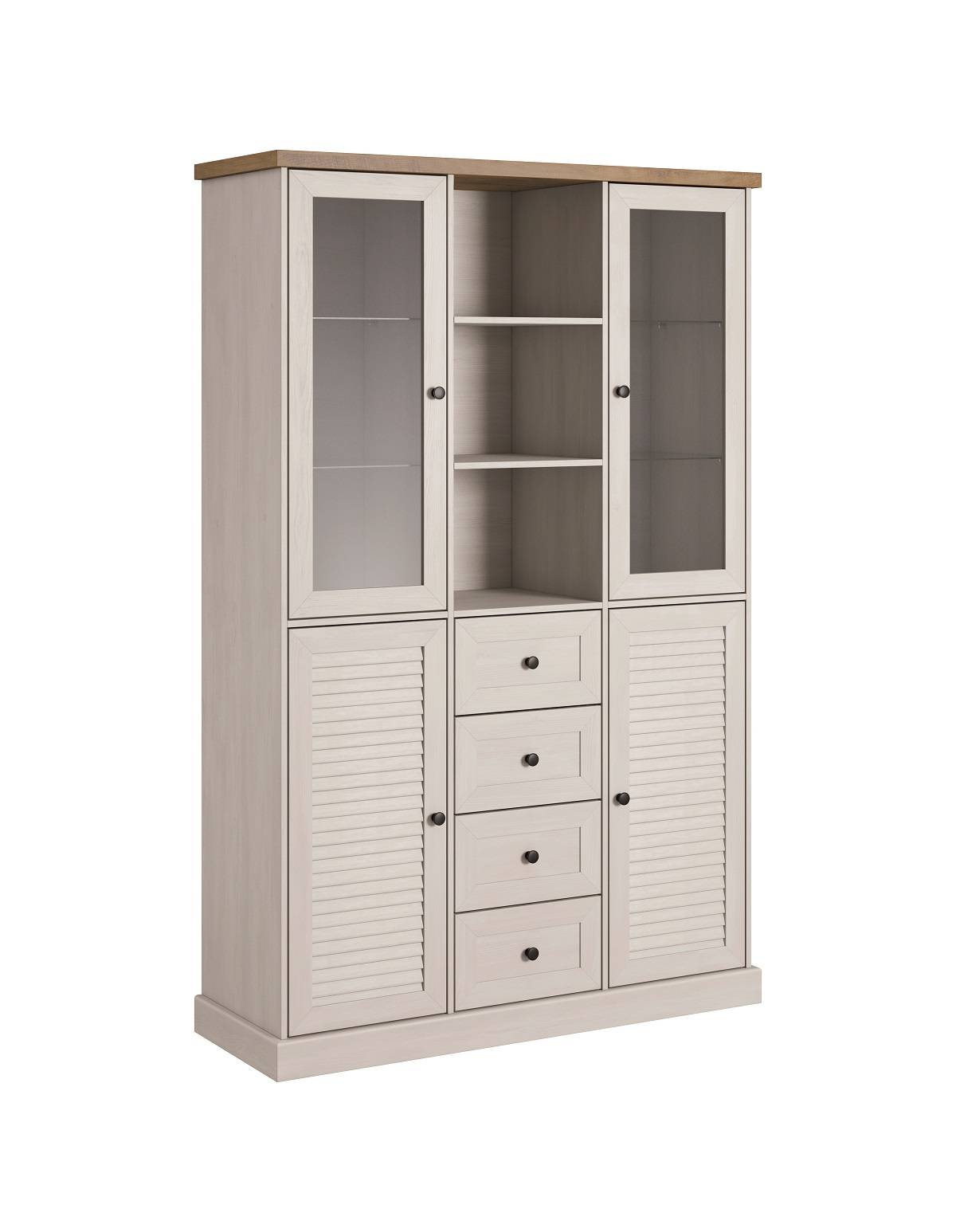 • Vitrína BOSTON s dvomi sklenenými dvierkami, dvomi plnými dvierkami a štyrmi zásuvkami.