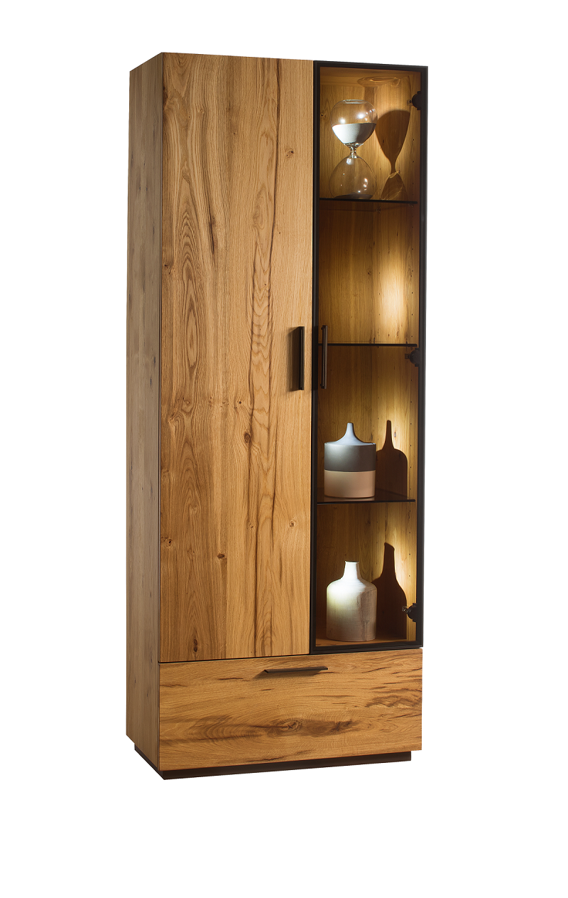 MORENO je kolekcia pri ktorej sú použité unikátne ručne opaľované dýhy zo starých dubov rastúcich vo vysokohorskej mikroklíme. Tento nábytok patrí medzi luxusné typy moderného prevedenia nábytku. Jedinečné spojenie naturálneho olejovaného farebného prevedenia kombinovaného s čiernou farbou tiahnú tento sektor k loftovému typu nábytku. Zaujímavo riešené prvky vytvoria vo Vašej obývačke alebo jedálni jedinečné miesto, ktoré bude pútať pozornosť aj o niekoľko rokov, pretože spojenie čiernej farby a prírodného dekoru vždy bolo a aj bude jedinečným spojení v oblasti bytového dizajnu. Nábytkom môžete kompletne vybaviť Vašu obývačku alebo spáleň a komody môžete využiť aj v predsieni, vstupnej chodbe alebo v spálnni. Skutočný dizajnérsky skvost - taký je nábytok MORENO. LED osvetlenia sklenených častí doťahujú celkový pohľad na tento luxusný nábytok.